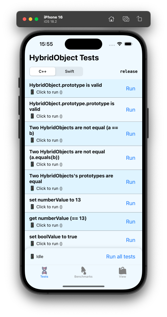 packages/react-native-nitro-test: Contains a lot of tests for C++/Swift/Kotlin Hybrid Objects, functions and types.packages/react-native-nitro-test-external: Contains a Hybrid Object that is used inreact-native-nitro-testto test cross-library-imports.